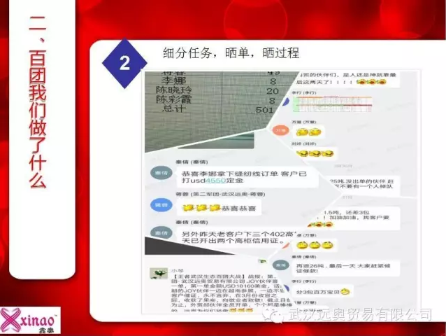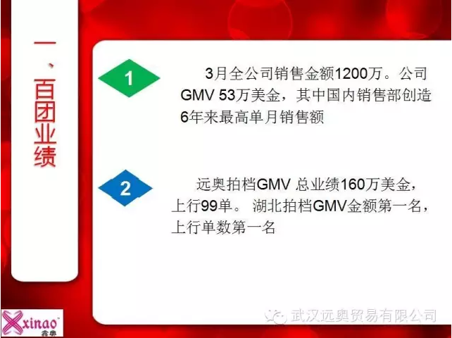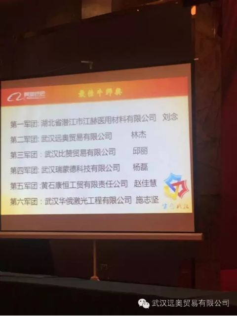 2016年4月6日,經(jīng)過(guò)了激烈的百團(tuán)大戰(zhàn)后,我公司3月全公司銷(xiāo)售金額為1200萬(wàn)。公司GMV 53萬(wàn)美金,其中國(guó)內(nèi)銷(xiāo)售部創(chuàng)造6年來(lái)最高單月銷(xiāo)售額。另外遠(yuǎn)奧拍檔GMV 總業(yè)績(jī)160萬(wàn)美金,上行99單。 湖北拍檔GMV金額第一名,上行單數(shù)第一名。阿里巴巴武漢分公司召開(kāi)了“大武漢生態(tài)百團(tuán)表彰大會(huì)”,我公司的林總經(jīng)理和外貿(mào)部經(jīng)理秦小姐被邀請(qǐng)到了現(xiàn)場(chǎng)接受表彰,在這次百團(tuán)大戰(zhàn)中,我公司員工士氣高漲,奮起拼搏,在大家的努力下,我公司獲得了“最佳一拍檔”,”先鋒戰(zhàn)隊(duì)“的榮譽(yù),我們的林總經(jīng)理獲得了”最佳牛師獎(jiǎng)“,我們的秦小姐獲得了”百萬(wàn)英雄“的榮譽(yù)稱(chēng)號(hào),此時(shí)正在公司拼搏的英雄們,收到這個(gè)消息后,都很是興奮,沒(méi)有什么比努力受到了認(rèn)可更讓人感到欣慰的了。